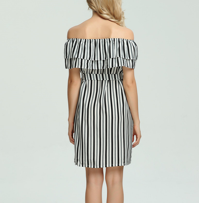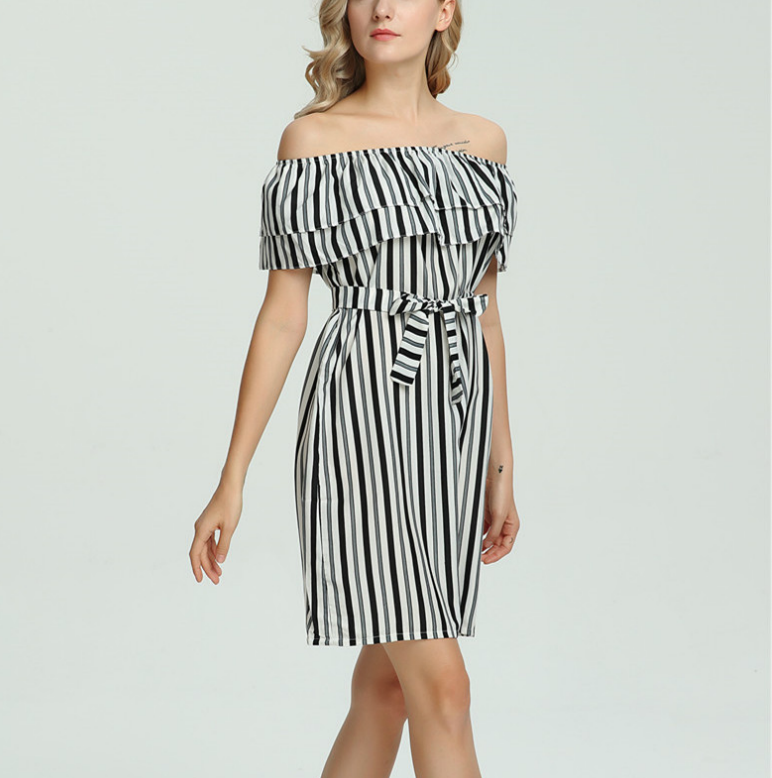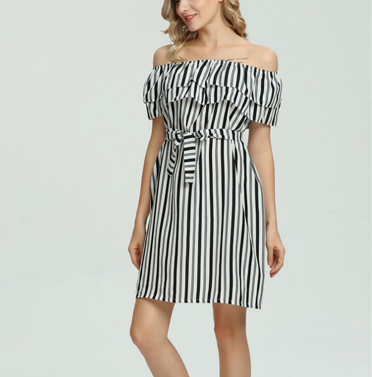 Women's Stripes Printing Skirts Summer Sexy Off-Shoulder Chiffon Dress 4 Sizes
