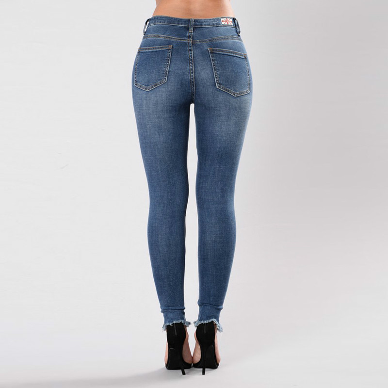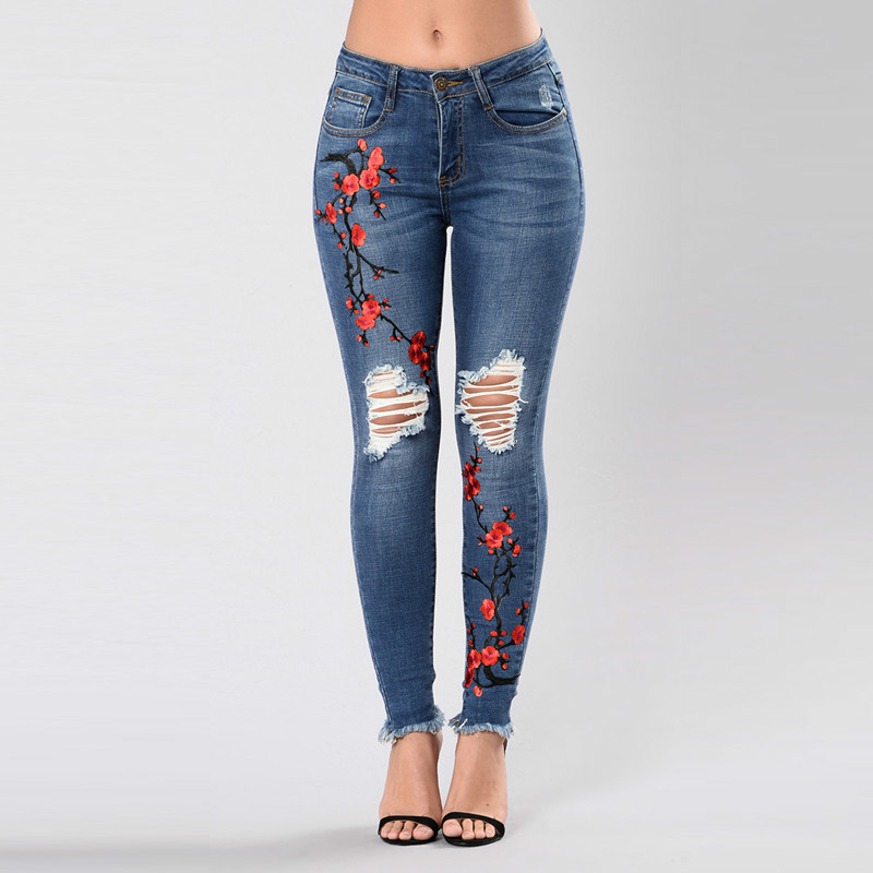 Women's Flowers Embroidered Elastic Jeans Holes Design Boy Friend Sexy Pencil Jeans 5 Sizes
