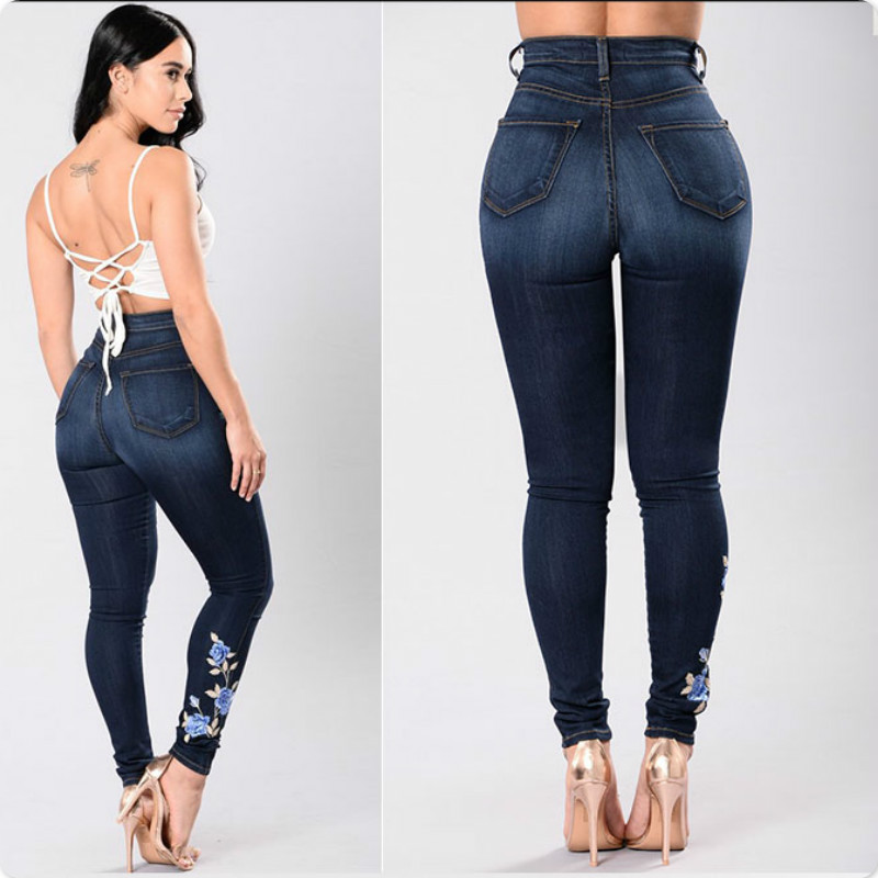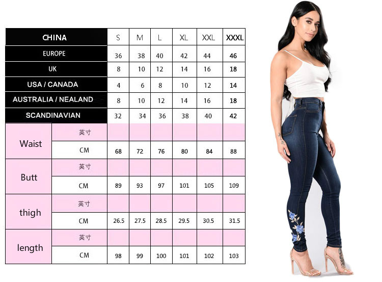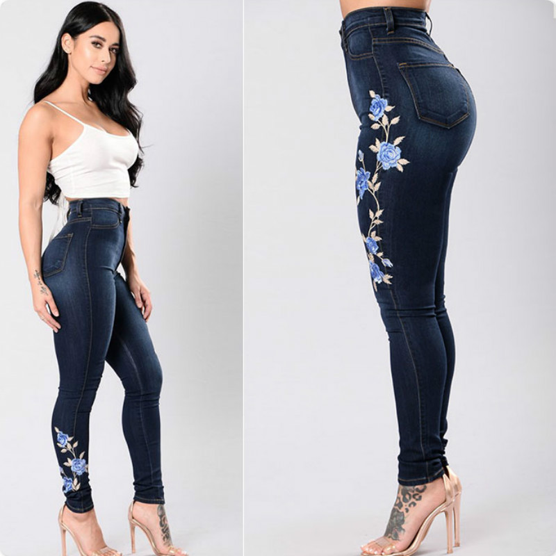Women's Flowers Embroidered Elastic Jeans Boy Friend Sexy Pencil Jeans 6 Sizes