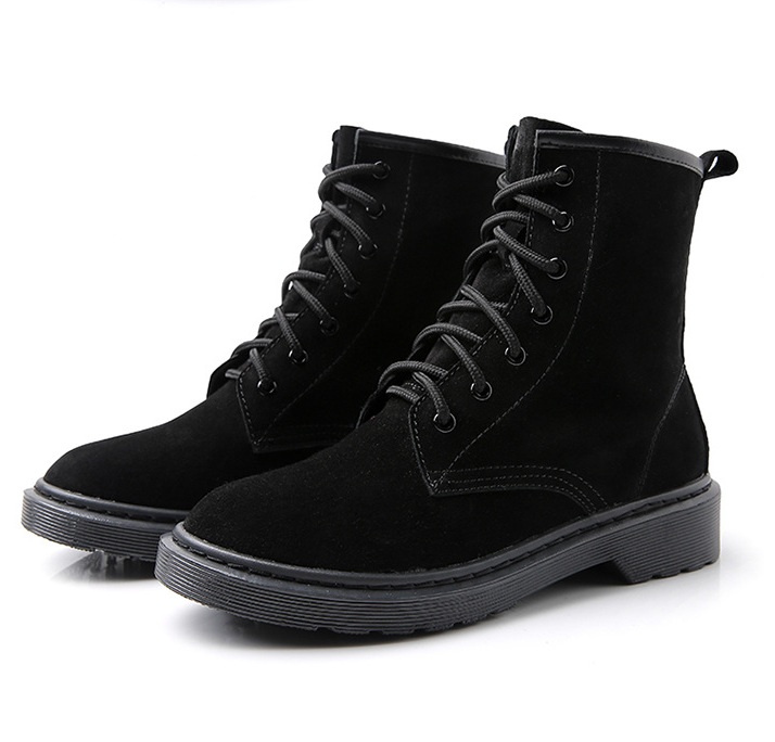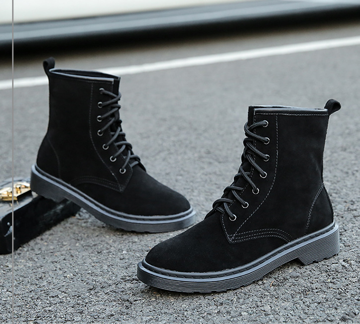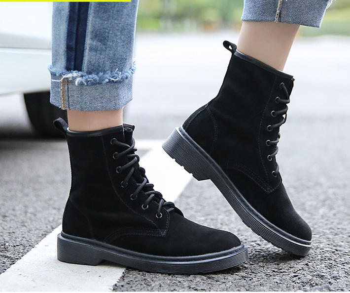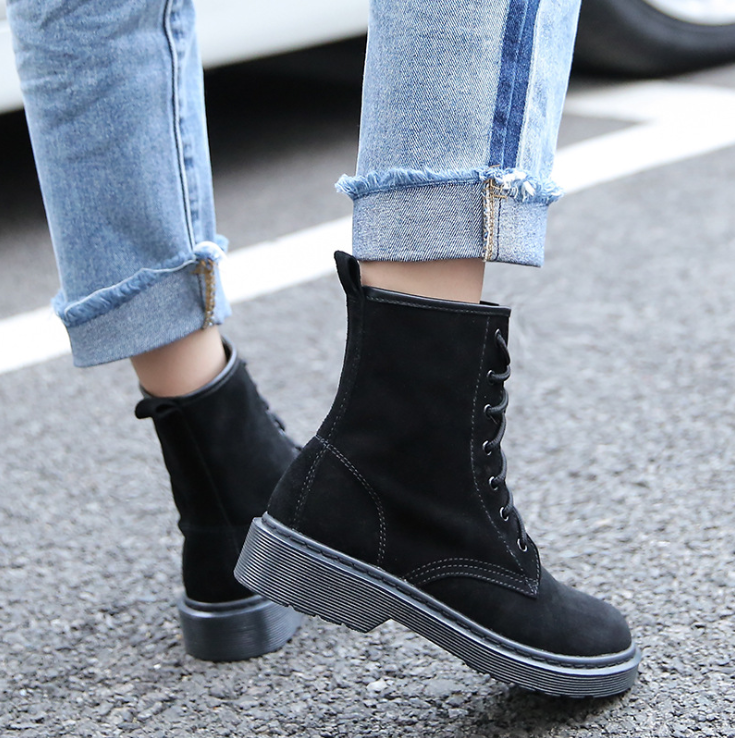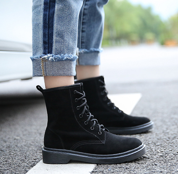 Women's Fashion Round Head Black Martin Boots Girls Fashion Middle Tube Leather Boots