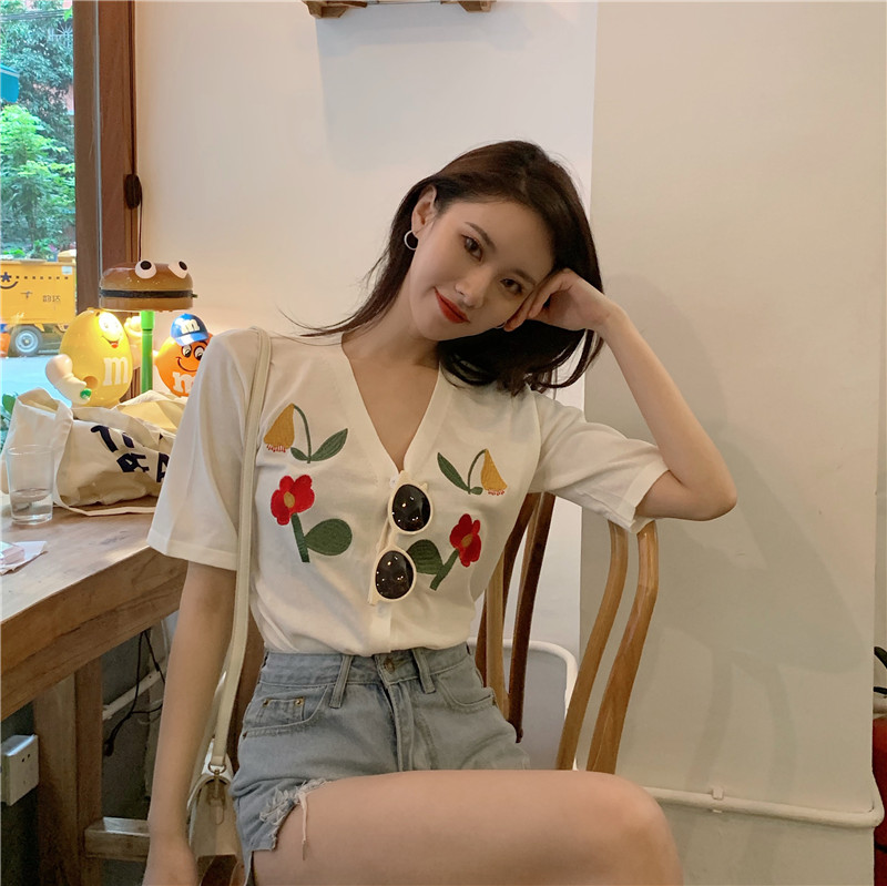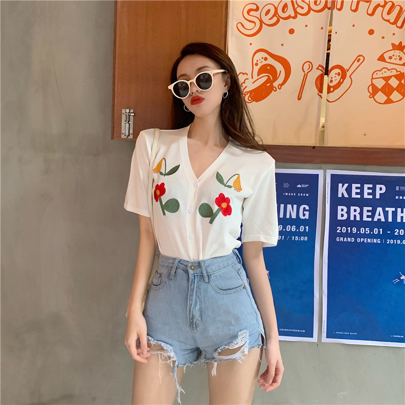 Women's Summer New Fashion Flowers Embroidery V-Collar White Thin Sweater Women's Vintage Style Short-sleeved Blouse