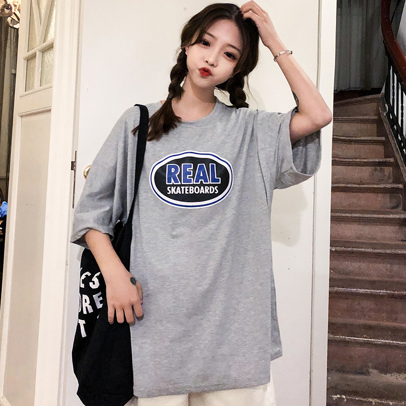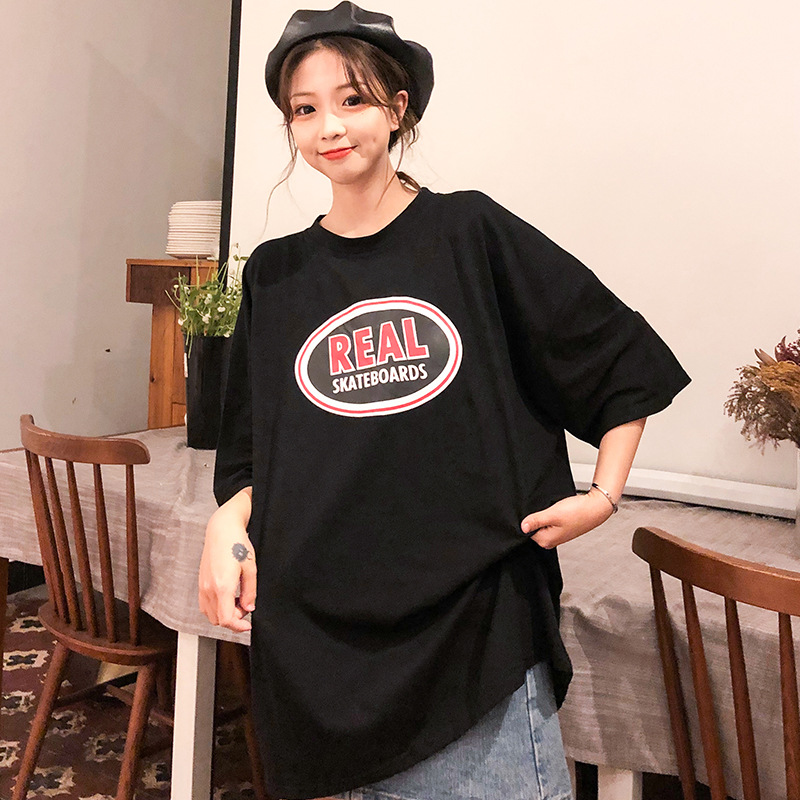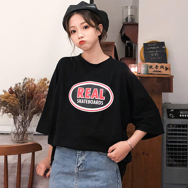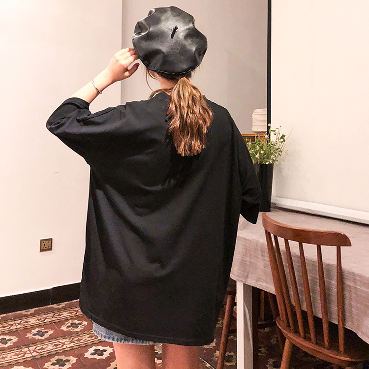 Women's Loose Printed Cotton T-shirts Big Girl's Black Loose Style Casual T-shirts 3 Sizes 2 Colors