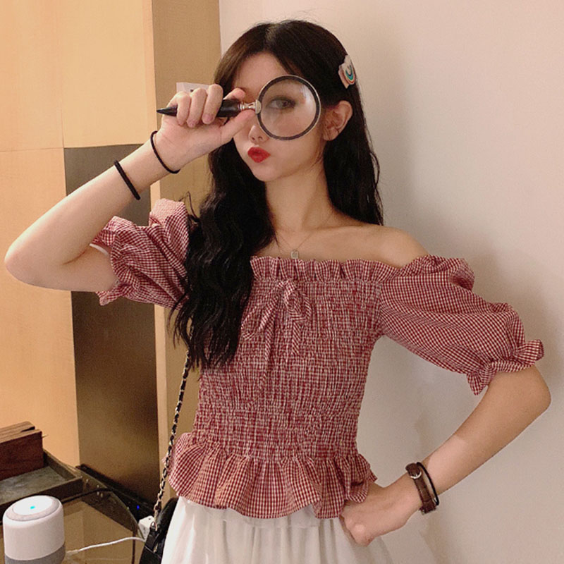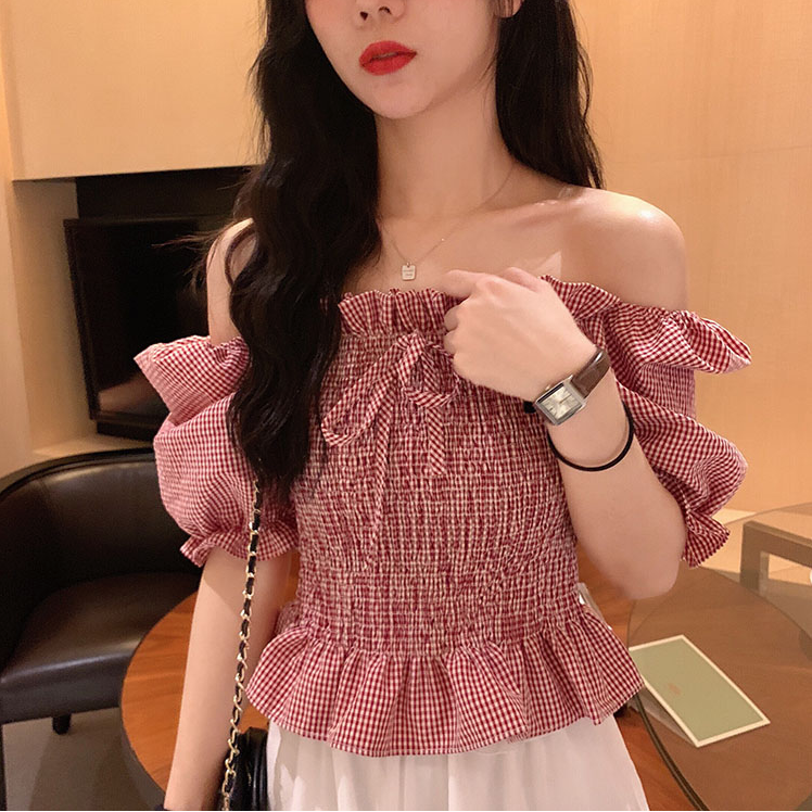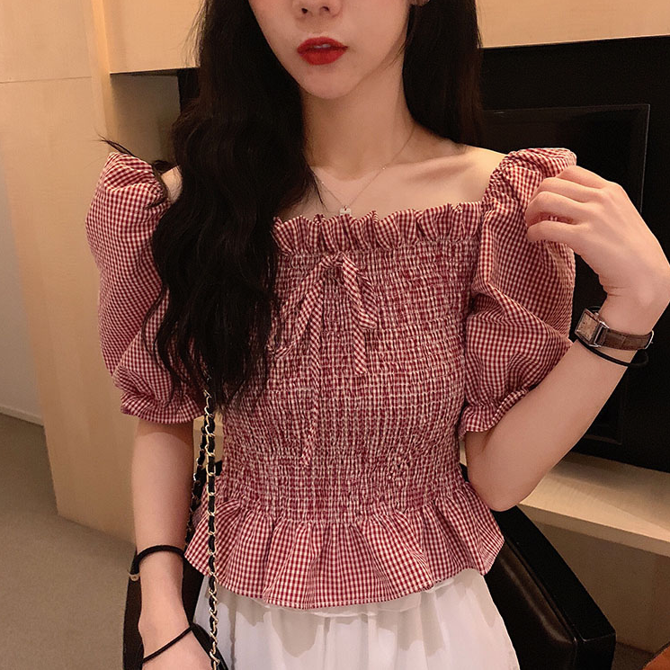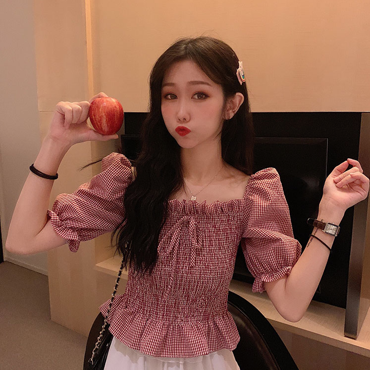 Retro Short-sleeved Shirt Red Bubble Sleeve Square Collar Plaid Top