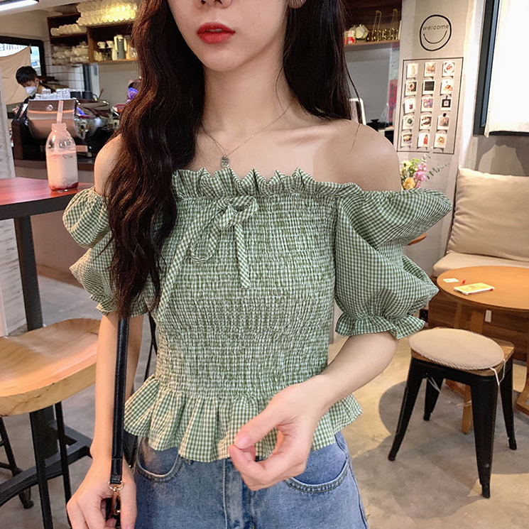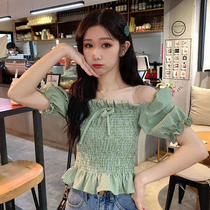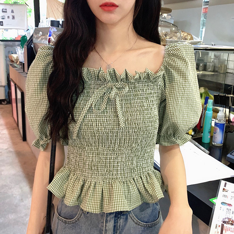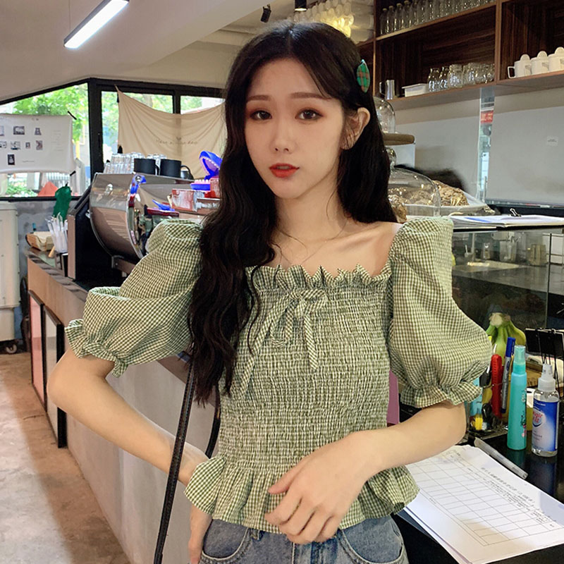 Retro Short-sleeved Shirt Green Bubble Sleeve Square Collar Plaid Top