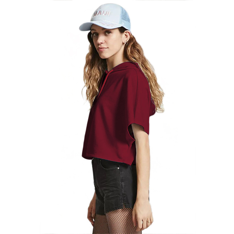 Women's Short Sleeve Cropped Top Burgundy Hooded T-shirts 4 Sizes